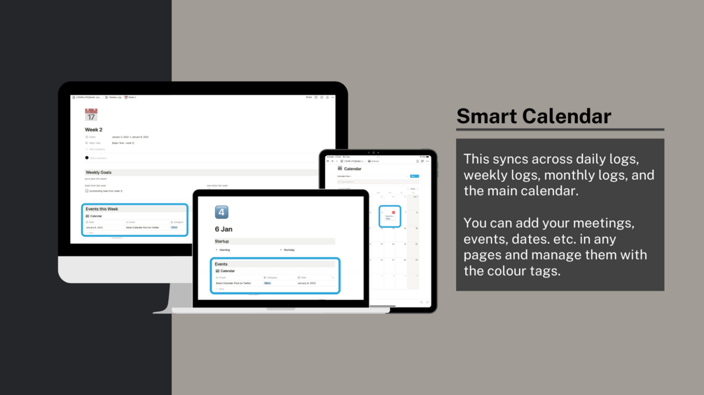 - Calendar - this can be found in the future log, monthly log, weekly log, and daily log. Add your meetings, parties, events, and the holidays to the calendar wherever you see it and manage them with tags.